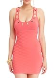 Heavy on the hardware. Sleeveless bandage dress with quilted seaming, a crisscross back, and sexy studded neck with cut-out shoulder detail. We're rocking it with metal plated heels and red lips.