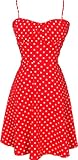 50s style cotton polkadot print knee-length dress with spaghetti straps accentuates in all the right places. Zip back.