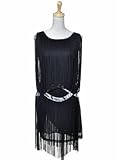 Get swinging with this black party dress. This dress features all-over long hanging fringe, silver colored trim along the waist and beaded neckline. Pair this dress with silver strappy heels to complete the look. DETAILS: - SMALL/MEDIUM FIT - BUST:34" - ACROSS SHOULDER: 15" - BODY LENGTH:31" - COLOR: Black - Material: Polyester/Organza