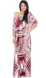 Another stunning graphic designer print on Koh Koh's super popular one shoulder 3/4 sleeve maxi dress design. This great maxi dress features 3/4 sleeves, a matching strip waits belt and has elastic at the mid-waist which makes it a great fit for all body sizes.