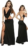 Our Sexy Black Cowl Neck Floor Length Gown features an elegant halter style with O-ring embellished ties around the neck, draping cowl neckline with inverted V bodice that has side cut outs and fully open back with tie straps and figure flattering full-length skirted bottom with a sexy side slit and straight hemline.